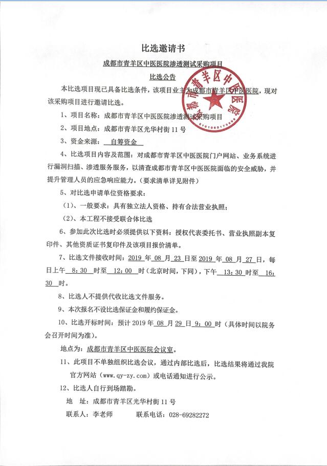 成都市青羊区中医医院渗透测试采购项目比选公告